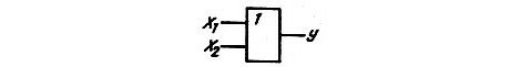 Теперь элемент НЕ. У него может быть только один вход Х и один выход Y. Символ элемента НЕ тоже "1" в прямоугольнике, но ещё имеется маленький кружок, там, где линия выхода. Этот кружок - символ отрицания.
